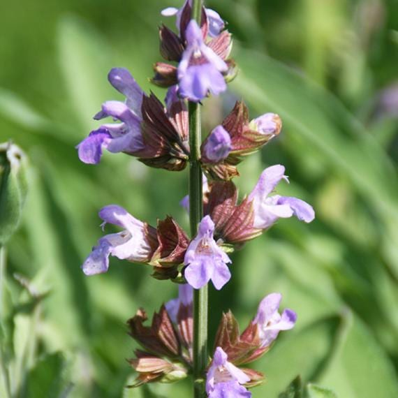 やや白み掛かる葉、よく分枝し初夏から夏にかけて淡いブルーの花を咲かせる、葉は薬味や、エッセンシャルオイル、ハーブティーはコモンセイジよりも好まれて利用されてきた。