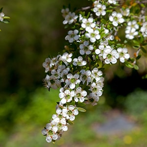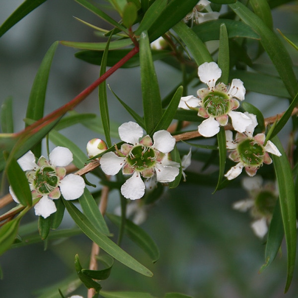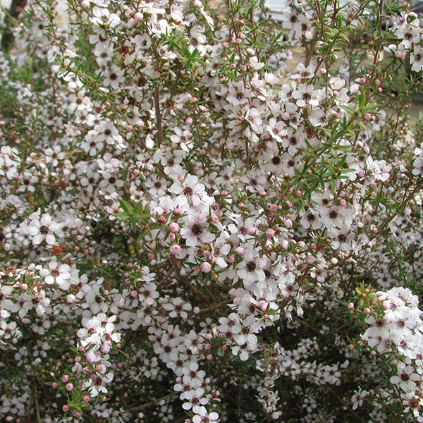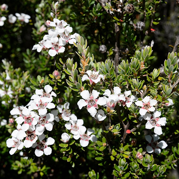 東オーストラリアからニュージーランドに見られ、葉は細かく、ウメに似た白花・薄桃花が早春に開花。マヌカのハチミツは有名。