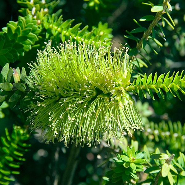 西オーストラリア南西部原産。花はブラシ状でライムグリーンの珍しい花色。葉は固く密集し、剪定にも耐える。やや栽培は難しい。